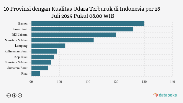 Berikut daftar 10 provinsi dengan indeks kualitas udara terburuk di Indonesia pada Senin, 28 Juli 2025 pukul 08.00 WIB.