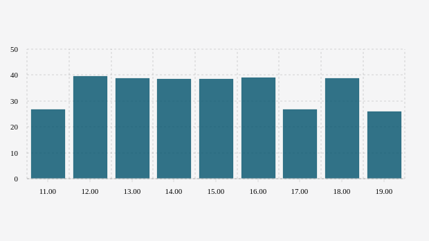 Konsentrasi PM2.5 udara Jakarta terendah berada di level 25,9 µg/m³ pada pukul 19.00 WIB, sedangkan konsentrasi PM2.5 tertinggi pada pukul 12.00 WIB dengan nilai 39,6 µg/m³.