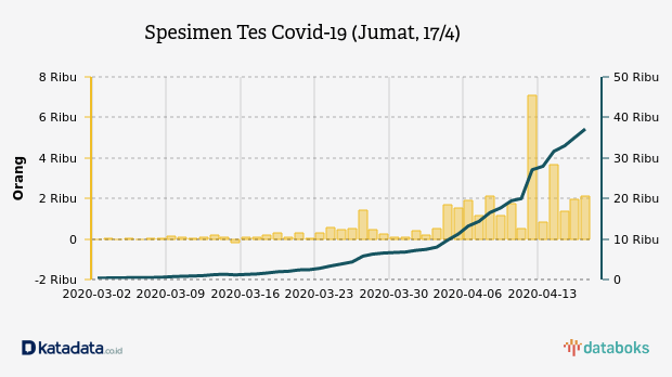 Pemerintah mengumumkan sudah melakukan pemeriksaan terhadap 37.134 spesimen terkait Covid-19. Sebanyak 31.211 spesimen dinyatakan negatif, dan 5.923 positif terjangkit Covid-19.