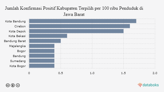 Jumlah penambahan konfirmasi positif Covid-19 di Jawa Barat saat ini paling tinggi terjadi di kota Bandung dengan jumlah 1,7 kasus per 100 ribu penduduk per minggu pada Rabu, 22 Desember 2021. Angka ini selisih 0 kasus dibandingkan catatan kasus di wilayah lain yang berada di urutan kedua.