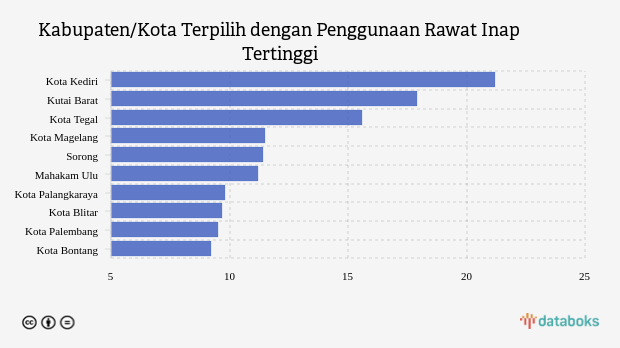 Penggunaan rawat inap lima kabupaten/kota teratas dengan angka lebih dari 11,45 pasien per 100 ribu penduduk/minggu, yaitu kota Kediri, Kutai Barat, kota Tegal, kota Magelang dan Sorong dengan masing-masing nilai 21,17 pasien per 100 ribu penduduk/minggu, 17,9 pasien per 100 ribu penduduk/minggu, 15,59 pasien per 100 ribu penduduk/minggu, 11,48 pasien per 100 ribu penduduk/minggu dan 11,45 pasien per 100 ribu penduduk/minggu.