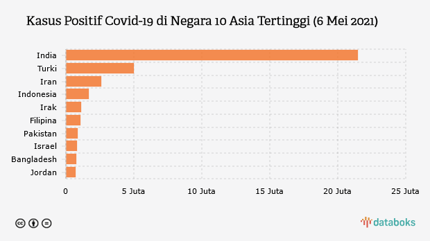 Posisi Indonesia didahului oleh India, Turki, dan Iran. Secara rinci, India memiliki 21.485.285 kasus positif corona, Turki 4.977.982 kasus, dan Iran 2.610.018 kasus. Ketiga negara tersebut memiliki jumlah kasus positif yang besar lantaran tengah dihantam oleh gelombang kedua dan ketiga corona.