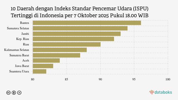 Berikut daftar 10 provinsi dengan indeks kualitas udara terburuk di Indonesia pada Selasa, 7 Oktober 2025 pukul 18.00 WIB.