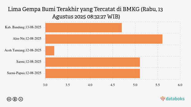 Gempa dengan kekuatan magnitude (M) 4,7 di Kabupaten Bandung."Pusat gempa berada di laut 82 km barat daya Kabupaten Bandung dan gempa ini dirasakan untuk diteruskan pada masyarakat." tulis BMKG (Badan Meteorologi, Klimatologi, dan Geofisika) melalui website resminya, Rabu, 13 Agustus 2025.