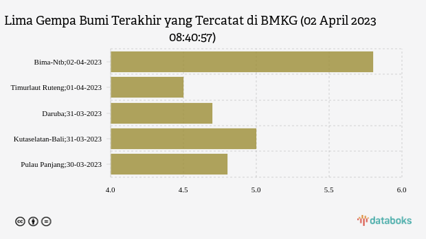 Gempa dengan kekuatan magnitude (M) 5,8 di Bima Ntb. Pusat gempat berada di 70."Pusat gempa berada di 70 BaratLaut km barat laut Bima Ntb dan tidak berpotensi tsunami." tulis BMKG (Badan Meteorologi, Klimatologi, dan Geofisika) melalui website resminya, 02 April 2023.