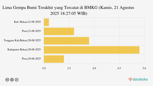 Gempa dengan kekuatan magnitude (M) 3,1 di Kabupaten Bekasi."Pusat gempa berada di darat 17 km tenggara Kabupaten Bekasi dan gempa ini dirasakan untuk diteruskan pada masyarakat." tulis BMKG (Badan Meteorologi, Klimatologi, dan Geofisika) melalui website resminya, Kamis, 21 Agustus 2025.