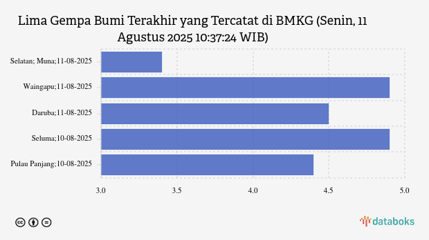 Gempa dengan kekuatan magnitude (M) 3,4 di Wakorumba Selatan, Muna."Pusat gempa berada di laut 4 km barat laut Wakorumba Selatan, Muna dan gempa ini dirasakan untuk diteruskan pada masyarakat." tulis BMKG (Badan Meteorologi, Klimatologi, dan Geofisika) melalui website resminya, Senin, 11 Agustus 2025.
