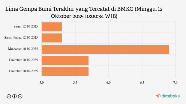 Gempa dengan kekuatan magnitude (M) 5,3 di Sarmi."Pusat gempa berada di darat 100 km tenggara Sarmi dan gempa ini dirasakan untuk diteruskan pada masyarakat." tulis BMKG (Badan Meteorologi, Klimatologi, dan Geofisika) melalui website resminya, Minggu, 12 Oktober 2025.