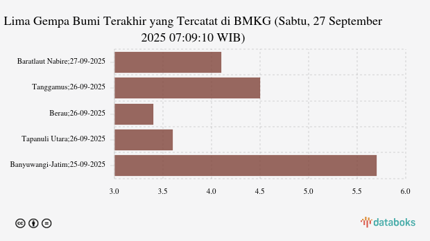 Gempa dengan kekuatan magnitude (M) 4,1 di Nabire."Pusat gempa berada di darat 5 km barat laut Nabire dan gempa ini dirasakan untuk diteruskan pada masyarakat." tulis BMKG (Badan Meteorologi, Klimatologi, dan Geofisika) melalui website resminya, Sabtu, 27 September 2025.