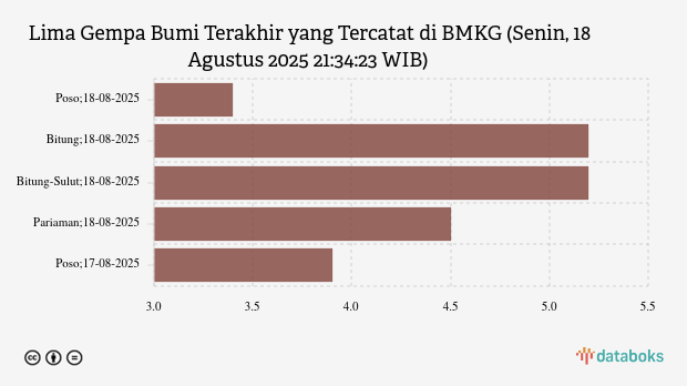 Peristiwa gempa terkini getarkan Poso berkekuatan 3,4 magnitudo, pada Senin, 18 Agustus 2025. Dalam Rilis Badan Meteorologi, Klimatologi, dan Geofisika (BMKG) pusat gempa bumi berada di darat sekitar 15 kilometer barat laut Poso.