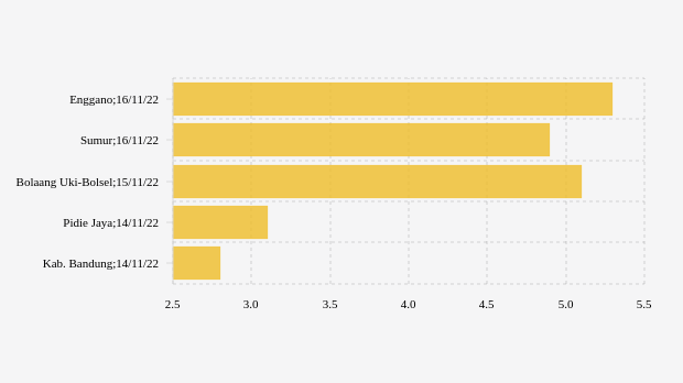 Gempa dengan kekuatan magnitude (M) 5.3 Skala Richter di Enggano. Pusat gempat berada di darat."Pusat gempa berada di darat 12 km Tenggara Enggano." tulis BMKG (Badan Meteorologi, Klimatologi, dan Geofisika) melalui website resminya, 16 November 2022.