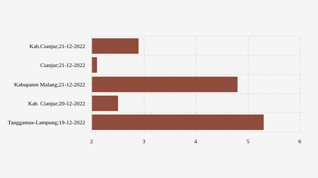 Gempa dengan kekuatan magnitude (M) 2,9 di kab.Cianjur. Pusat gempat berada di darat."Pusat gempa berada di darat 5 km barat laut kab.Cianjur." tulis BMKG (Badan Meteorologi, Klimatologi, dan Geofisika) melalui website resminya, 21 Desember 2022.