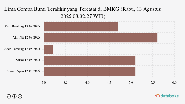 Lima Gempa Bumi Terakhir yang Tercatat di BMKG (Rabu, 13 Agustus 2025 08:32:27 WIB)