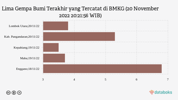 Peristiwa gempa terkini getarkan Lombok Utara berkekuatan 3.8 Skala Richter, pada 20 November 2022. Dalam Rilis Badan Meteorologi, Klimatologi, dan Geofisika (BMKG) pusat gempa bumi berada di laut sekitar 14 kilometer barat daya Lombok Utara.