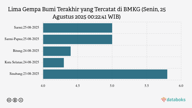 (Baca: Lima Gempa Bumi Terakhir yang Tercatat di BMKG (Senin, 25 Agustus 2025 00:22:41 WIB))