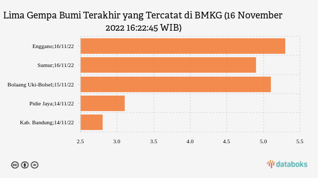 "Gempa dirasakan Magnitude: 5.3 Skala Richter,16 November 2022 16:22:45 WIB", tulis BMKG pada keterangan rilisnya. Gempa terjadi pada koordinat pada 5.38 LS (Lintang Selatan) dan 102.38 BT (Bujur Timur).