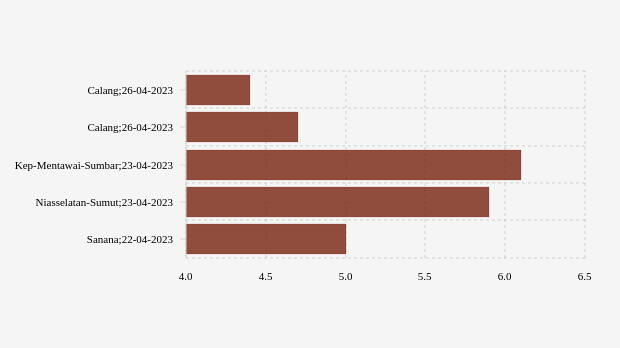 Gempa dengan kekuatan magnitude (M) 4,4 di Calang. Pusat gempat berada di laut."Pusat gempa berada di laut 53 km barat daya Calang dan gempa ini dirasakan untuk diteruskan pada masyarakat." tulis BMKG (Badan Meteorologi, Klimatologi, dan Geofisika) melalui website resminya, 26 April 2023.