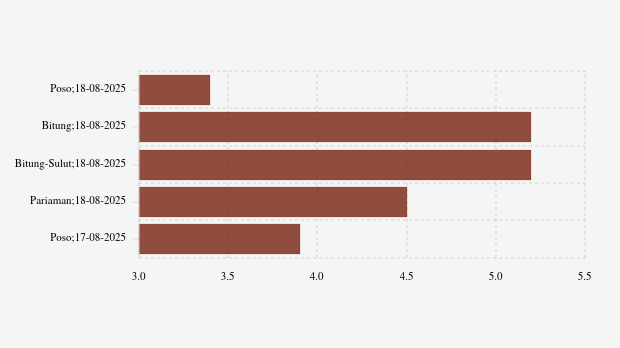 Peristiwa gempa terkini getarkan Poso berkekuatan 3,4 magnitudo, pada Senin, 18 Agustus 2025. Dalam Rilis Badan Meteorologi, Klimatologi, dan Geofisika (BMKG) pusat gempa bumi berada di darat sekitar 15 kilometer barat laut Poso.
