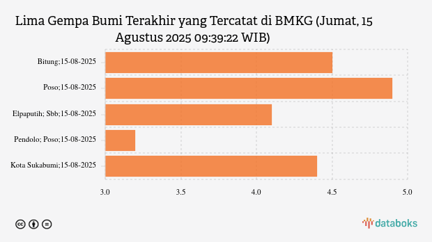 Lima Gempa Bumi Terakhir yang Tercatat di BMKG (Jumat, 15 Agustus 2025 10:32:00 WIB)
