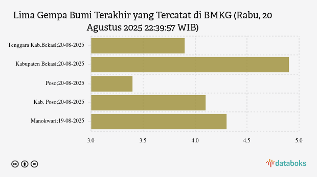 Gempa dengan kekuatan magnitude (M) 3,9 di KabupatenBekasi."Pusat gempa berada di darat 15 km tenggara KabupatenBekasi dan gempa ini dirasakan untuk diteruskan pada masyarakat." tulis BMKG (Badan Meteorologi, Klimatologi, dan Geofisika) melalui website resminya, Rabu, 20 Agustus 2025.