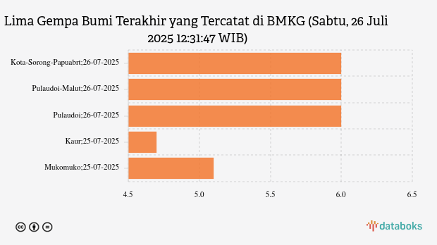 "Gempa dirasakan Magnitudo: 6,0 pada Sabtu, 26 Juli 2025 12:31:47 WIB", tulis BMKG pada keterangan rilisnya. Gempa terjadi pada koordinat pada 0.39 LS (Lintang Selatan) dan 131.60 BT (Bujur Timur).