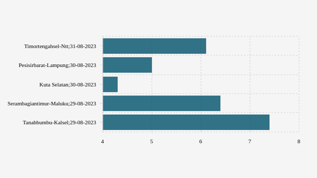 "Gempa dirasakan Magnitudo: 6,1 pada 31 Agustus 2023 10:29:30", tulis BMKG pada keterangan rilisnya. Gempa terjadi pada koordinat pada 9.69 LS (Lintang Selatan) dan 124.10 BT (Bujur Timur).