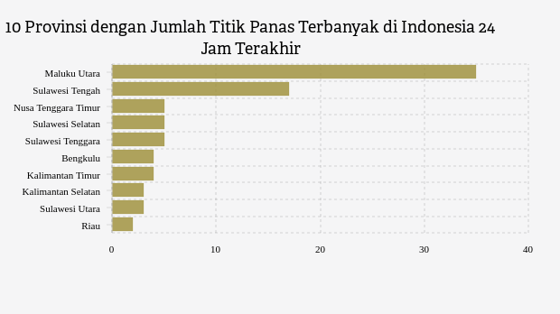 Titik panas terdeteksi paling banyak berada di Maluku Utara sebanyak 35 titik. Sulawesi Tengah menempati posisi kedua jumlah titik panas terbanyak dengan 17 titik. Nusa Tenggara Timur berada di posisi ketiga sebanyak 5 titik panas.