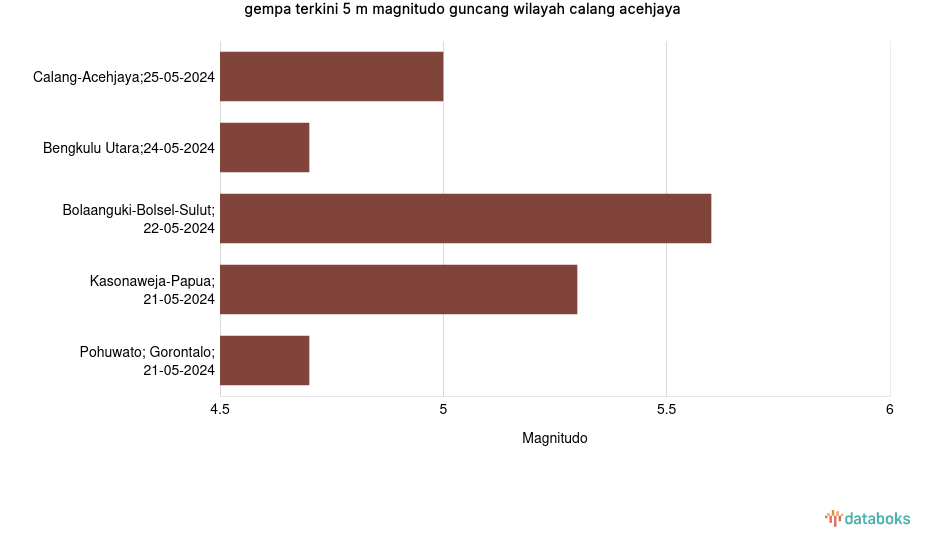 Gempa dengan kekuatan magnitude (M) 5,0 di Calang Acehjaya. Pusat gempat berada di 143."Pusat gempa berada di 143 BaratDaya km barat daya Calang Acehjaya dan tidak berpotensi tsunami." tulis BMKG (Badan Meteorologi, Klimatologi, dan Geofisika) melalui website resminya, 25 Mei 2024.