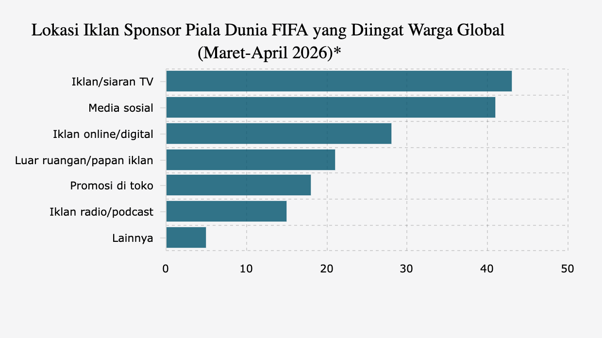 Menurut survei YouGov, iklan sponsor Piala Dunia yang paling banyak diingat warga global adalah iklan yang muncul di televisi.