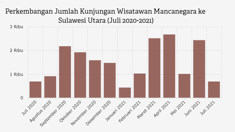Kunjungan wisatawan mancanegara (wisman) secara bulanan di Sulawesi Utara pun mengalami penurunan tajam pada Juli 2021. Menurut catatan Badan Pusat Statistik (BPS), terdapat 695 wisman ke Sulawesi Utara pada Juli 2021, berkurang 71,5% dari bulan sebelumnya yang sebesar 2.435 wisman.