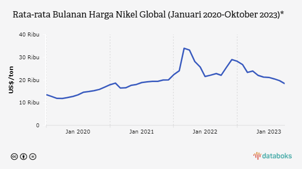 Menurut data Bank Dunia, rata-rata harga nikel pada Oktober 2023 turun hingga mencapai rekor terendah sejak 2022. Bank Dunia juga memproyeksikan harganya akan terus melemah sampai 2024.