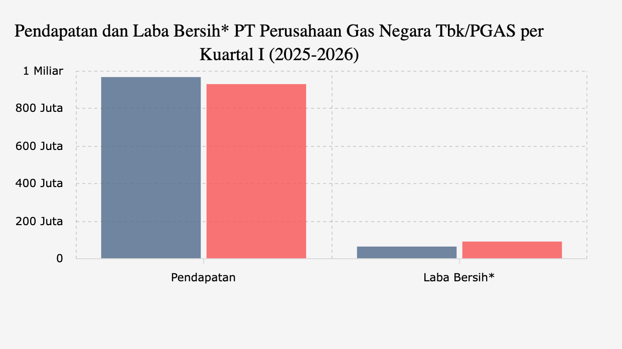 PT Perusahaan Gas Negara (Persero) Tbk atau PGN (PGAS) membukukan laba sebesar US$90,45 juta pada kuartal I 2026, naik 46% dibanding kuartal I tahun lalu (yoy).