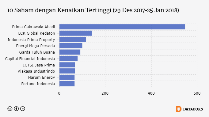 Adapun saham LCKM yang baru dicatatkan di bursa Jakarta pada 16 Januari 2018 telah 140,4% menjadi Rp 500 dari harga perdana Rp 208 per lembar, dan saham dengan kode perdagangan OMRE juga menguat 116,15% menjadi Rp 1.900 per lembar. Kenaikan tiga saham tersebut jauh melampaui kenaikan IHSG yang hanya sebesar empat persen. Optimisme investor terhadap pertumbuhan ekonomi seiring naiknya peringkat investasi dan menjelang musim keluarnya laporan keuangan tahun buku 2017 memicu kenaikan harga saham di awal 2018 ini.