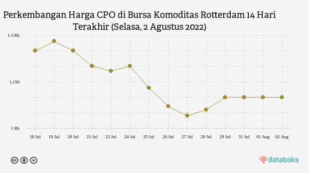 Harga CPO di bursa komoditas Rotterdam pagi hari ini hingga pukul 09.09 WIB berada di level US$ 1.100 per metrik ton data per Selasa, 02 Agustus 2022. Harga CPO di bursa komoditas Rotterdam ini hanya bergerak 3,77% dibanding penutupan Minggu, 31 Juli 2022 yang diperdagangkan US$ 1.100 per metrik ton. Perdagangan hari ini CPO di bursa komoditas Rotterdam diperkirakan bergerak pada rentang US$ 1.100 - 1.225 per metrik ton.