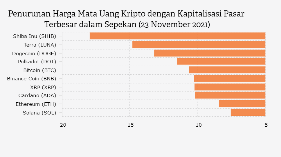 Harga mata uang kripto berkapitalisasi besar lainnya yang turun tajam adalah Terra (LUNA) sedalam 14,81% menjadi Rp 580.673,55 per koin. Diikuti Dogecoin (DOGE) yang turun 13,2% menjadi Rp 3.156,65 per koin, Polkadot (DOT) terkoreksi 11,49% menjadi Rp 561.067,55/koin.