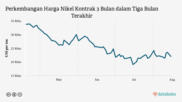 Perdagangan nikel di bursa London Metal Exchange (LME) turun 7.31% dalam dua hari terakhir hingga menembus US$ 21,9 ribu per ton. Pada Jumat, 12 Agustus 2022 harga nikel masih berada di level US$ 23,5 ribu per ton. Namun, transaksi pada Senin, 15 Agustus 2022 harga nikel untuk kontrak 3 bulan ke depan diperdagangkan pada harga US$ 21,9 ribu per ton.