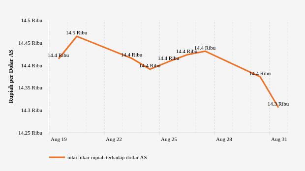 Nilai tukar rupiah berada di posisi Rp. 14,31 ribu per dolar Amerika Serikat (AS) dalam perdagangan Selasa, 31 Agustus 2021. Posisi rupiah tersebut menguat 68 poin atau 0,5% dari perdagangan hari sebelumnya.