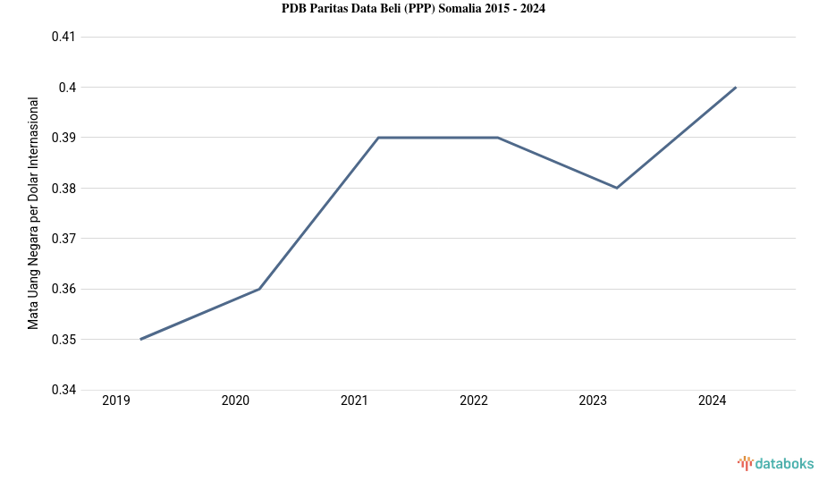 International Monetary Fund (IMF) mencatat PDB Paritas Daya Beli (PPP) Somalia pada 2024 berada di angka 0.4 Unit. Data ini menunjukkan peningkatan dibandingkan tahun 2023 yang berada di angka 0.38 Unit. Peningkatan ini mengindikasikan adanya perbaikan dalam daya beli masyarakat Somalia.