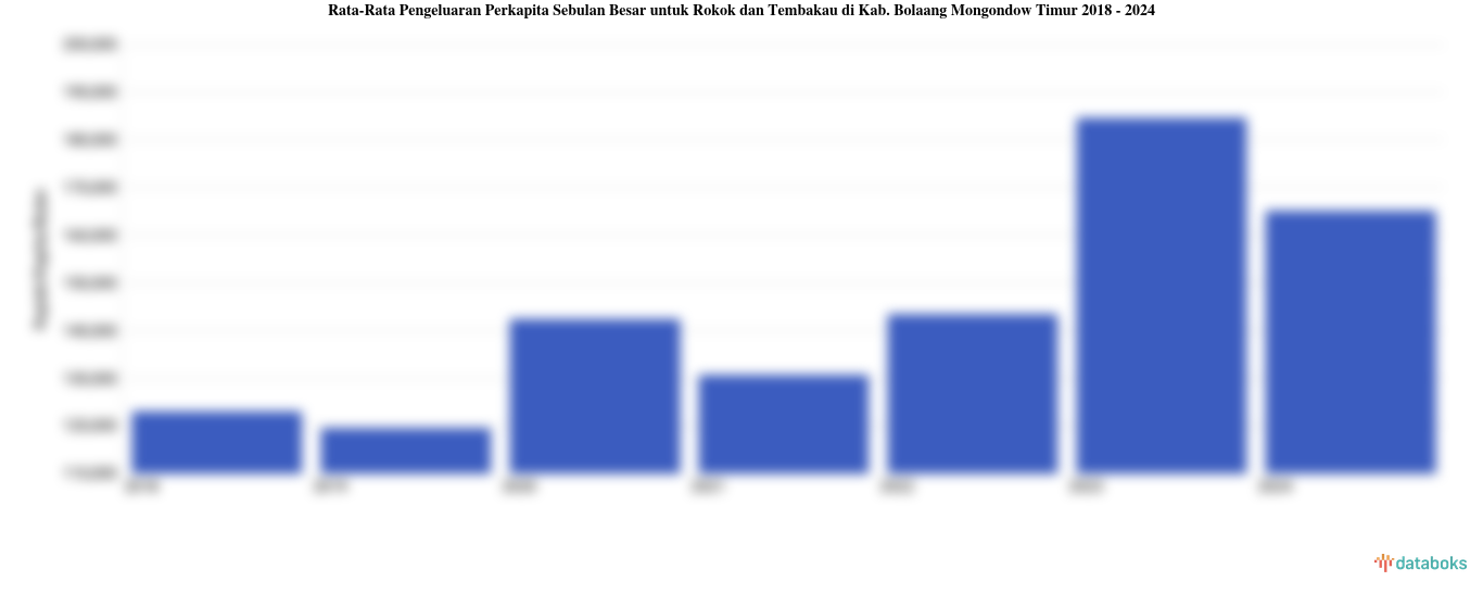 Secara historis, pengeluaran untuk rokok dan tembakau di Kabupaten Bolaang Mongondow Timur cenderung fluktuatif selama periode 2018-2024. Pada tahun 2018, pengeluaran tercatat sebesar Rp123.091. Sempat mengalami penurunan menjadi Rp119.548 pada tahun 2019, kemudian melonjak signifikan sebesar 19.1 persen menjadi Rp142.434 pada tahun 2020. Setelah itu, terjadi penurunan kembali sebesar 8.2 persen pada tahun 2021 menjadi Rp130.690. Tahun 2022 dan 2023 menunjukkan kenaikan masing-masing sebesar 9.8 persen dan 28.7 persen. Namun, pada tahun terakhir terjadi penurunan kembali.