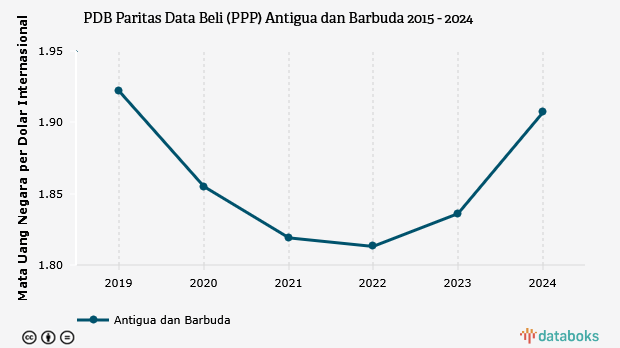 International Monetary Fund (IMF) mencatat PDB Paritas Daya Beli (PPP) Antigua dan Barbuda pada 2024 sebesar 1.91 Unit. Angka ini menunjukkan peningkatan dibandingkan tahun 2023 yang berada di angka 1.84 Unit, mengindikasikan adanya pertumbuhan ekonomi. Kenaikan ini menjadi sinyal positif setelah beberapa tahun sebelumnya mengalami fluktuasi.