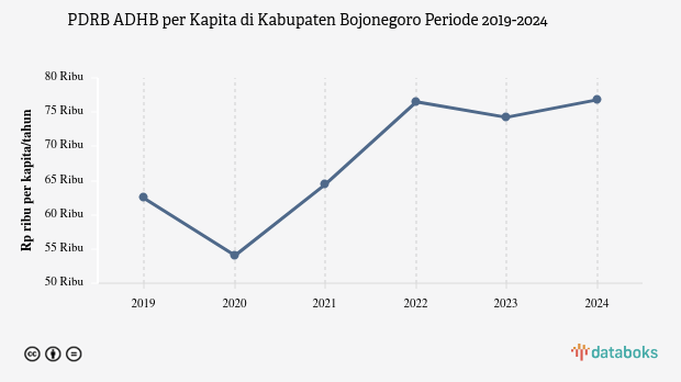PDRB ADHB per kapita di Kabupaten Bojonegoro tercatat Rp.76,81 juta/kapita/tahun data per 2024. Angka ini mengalami kenaikan. Dibandingkan dengan lima tahun sebelumnya, rata-rata pertumbuhan tahunan (CAGR) wilayah ini tercatat lebih rendah. Adapun pertumbuhan lima tahun terakhir, tercatat diangka 7,28%.