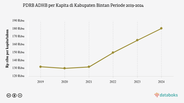 PDRB ADHB per kapita di Kabupaten Bintan tercatat Rp.180,54 juta/kapita/tahun data per 2024. Dalam empat tahun terakhir, PDRB ADHB per kapita terus mengalami kenaikan. Selama lima tahun terakhir, rata-rata pertumbuhan tahunan (CAGR) PDRB ADHB per kapita di wilayah ini sebesar 6,76%. Pertumbuhan ini lebih tinggi dibandingkan dengan pertumbuhan lima tahun sebelumnya yang tercatat 5,49%.