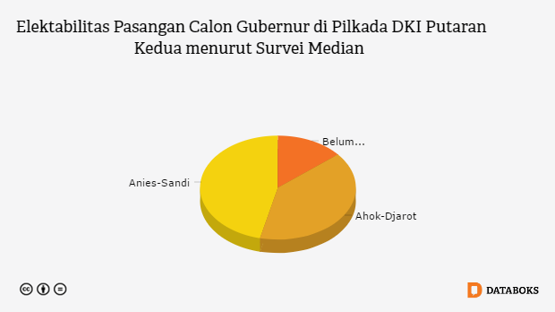 Elektabilitas pasangan Anies Baswedan-Sandiaga Uno sementara mengungguli Basuki Tjahaja Purnama (Ahok)-Djarot Saiful Hidayat menjelang pemilihan Putaran kedua. Berdasarkan survei Media Survei Indonesia (Median) tingkat keterpilihan Anies-Sandi sebesar 46,3 persen sedangkan Ahok-Djarot mememperoleh 39,7 persen. Sisanya belum menentukan pilihan.