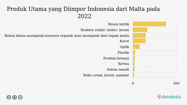 Di urutan kedua, impor Indonesia paling banyak adalah produk Reaktor nuklir, boiler, mesin dan peralatan mekanis. Nilai impor dari Malta pada 2022 tercatat US$ 164 ribu. Angka ini naik dibandingkan periode sebelumnya yang tercatat US$ 116 ribu.