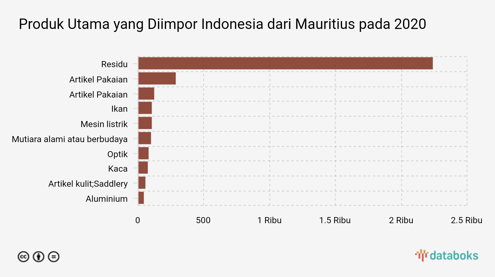 Di urutan kedua, impor Indonesia paling banyak adalah produk Artikel -artikel aksesoris pakaian dan pakaian, tidak dirajut atau dirajut. Nilai impor dari Mauritius pada 2020 tercatat US$ 285 ribu. Angka ini naik dibandingkan periode sebelumnya yang tercatat US$ 274 ribu.