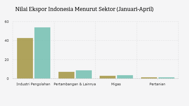 Nilai ekspor industri pengolahan sebesar US$ 53,87 miliar pada Januari hingga April 2021. Angka ini naik 25,96% dari tahun sebelumnya yang sebesar US$ 42,77%.
