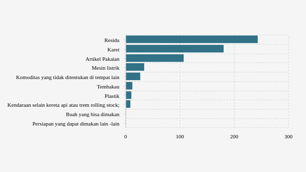 Di urutan pertama, Indonesia banyak mengekspor Residu dan limbah dari industri makanan. Dalam klasifikasi tradmap, Residu dan limbah dari industri makanan masuk kategori produk HS dengan kode 23. Produk ini merupakan jenis barang ekspor yang dikelompokkan bersama dengan dan Pakan ternak hewan yang disiapkan