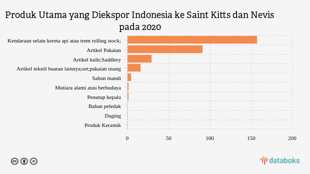 Di urutan kedua, ekspor Indonesia paling banyak adalah produk Artikel -artikel aksesoris pakaian dan pakaian, tidak dirajut atau dirajut. Nilai ekspor dari Saint Kitts dan Nevis pada 2020 tercatat US$ 91 ribu. Angka ini lebih rendah dibandingkan periode sebelumnya yang mampu menembus US$ 130 ribu.