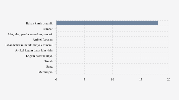 Bahan kimia organik dalam kategori produk dengan kode HS 29. Impor produk ini dari Wilayah Samudra Hindia Inggris berada di urutan pertama. Indonesia mengimpor sebanyak US$ 18 ribu. Pada tahun sebelumnya Indonesia tidak mencatat adanya impor dari negara ini.