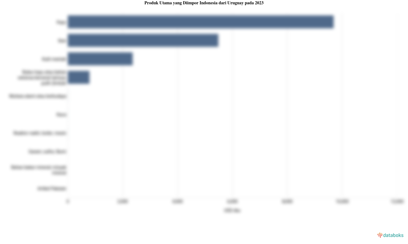 Di urutan kedua, impor Indonesia paling banyak adalah produk Ikan dan krustasea, moluska dan invertebrata air lainnya. Nilai impor dari Uruguay pada 2023 tercatat US$ 5,48 juta. Angka ini lebih rendah dibandingkan periode sebelumnya yang mampu menembus US$ 6.700 ribu.